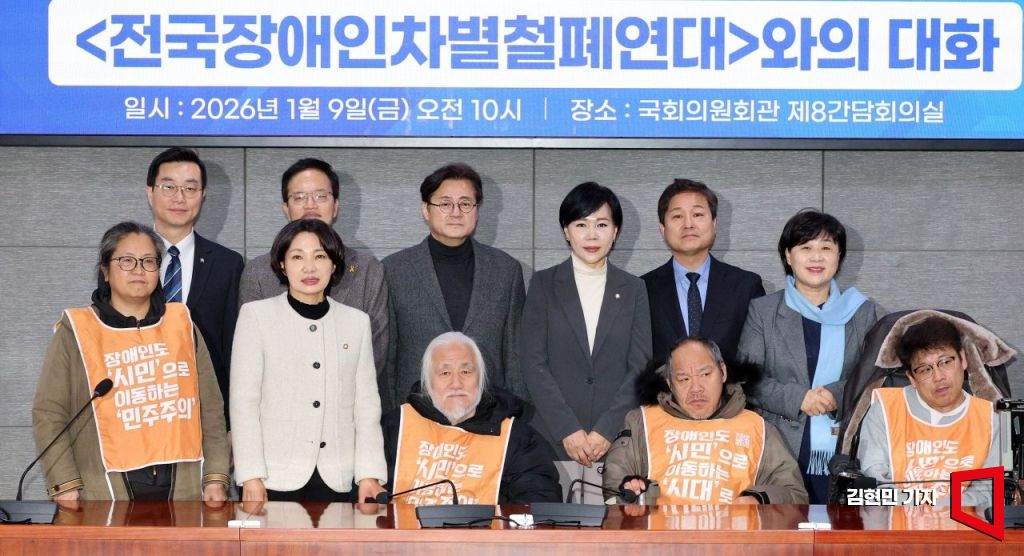 김영배, 서영교, 전현희, 박주민, 박홍근 등 더불어민주당 의원들과 박경석 전장연 상임대표 등 참석자들이 9일 국회 의원회관에서 열린 전국장애인차별철폐연대와의 대화에서 기념촬영하고 있다. 2026.1.9 김현민 기자