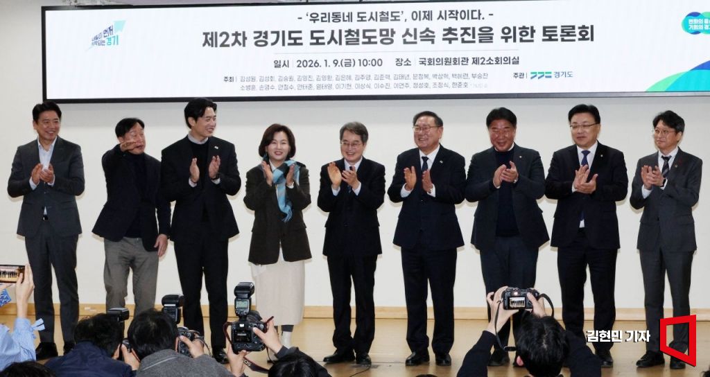 김동연 경기도지사를 비롯한 국회의원 등 참석자들이 9일 국회 의원회관에서 열린 제2차 경기도 도시철도망 신속 추진 국회토론회에서 기념촬영을 하고 있다.