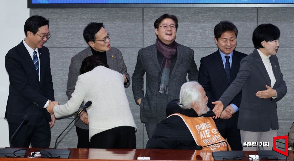 김영배, 서영교, 전현희, 박주민, 박홍근 등 더불어민주당 의원들과 박경석 전장연 상임대표 등 참석자들이 9일 국회 의원회관에서 열린 전국장애인차별철폐연대와의 대화에서 기념촬영하고 있다. 2026.1.9 김현민 기자