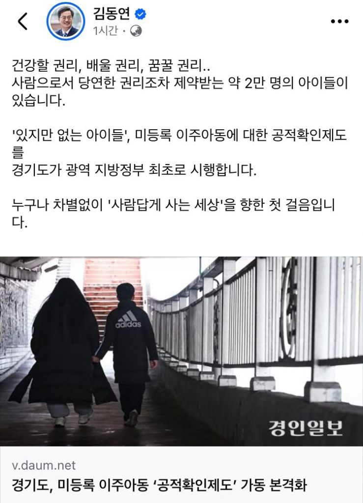 김동연 경기도지사가 미등록 이주아동에 대한 공적확인제도를 국내 최초로 시행한다고 알렸다.