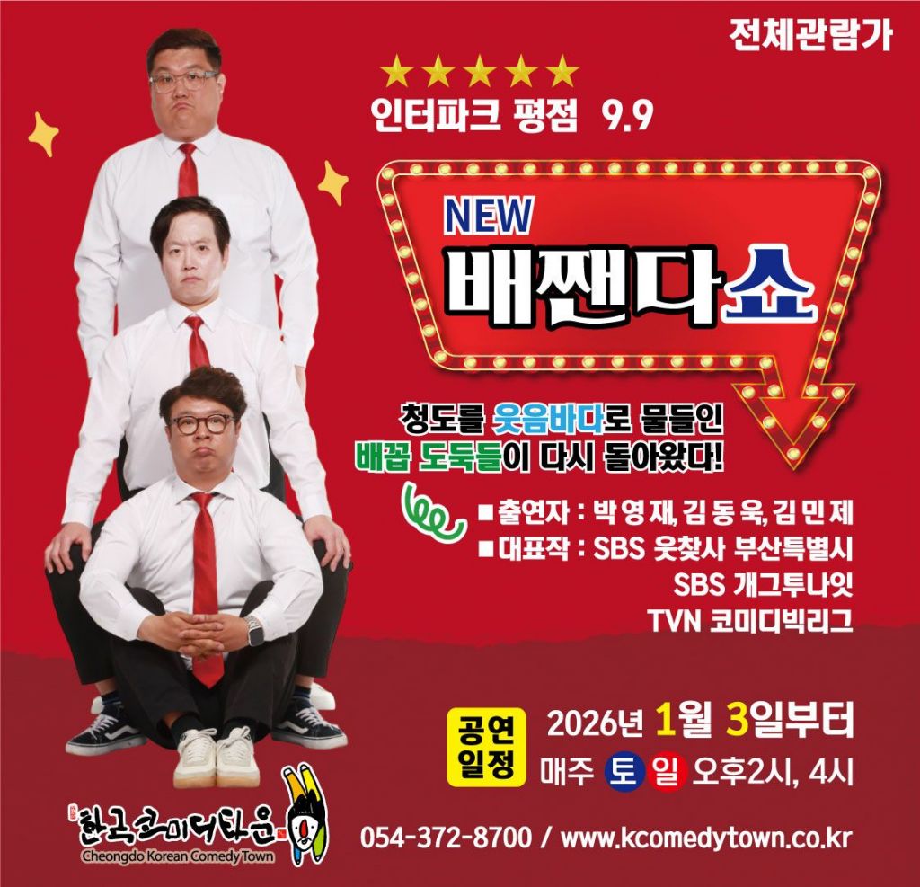 청도군은 새해를 맞아 한국코미디타운의 시그니처 공연인 'NEW 배짼다쇼'가 관람객들의 열렬한 호응 속에 업그레이드된 모습으로 상설 공연을 재개했다고 9일 밝혔다.