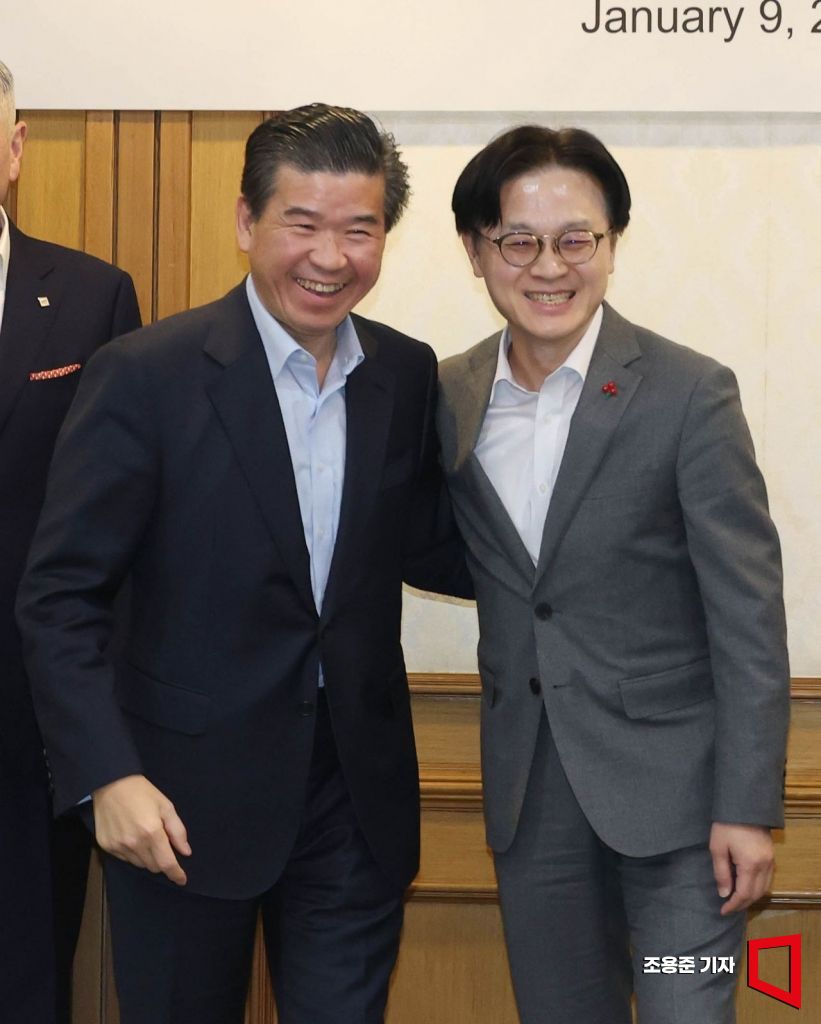 김정관 산업통상부 장관(오른쪽)이 9일 서울 종로구 정부서울청사에서 열린 주한미국상공회의소(AMCHAM) 초청 간담회에 참석, 제임스 김 암참 회장과 기념촬영을 마치고 활짝 웃고 있다.