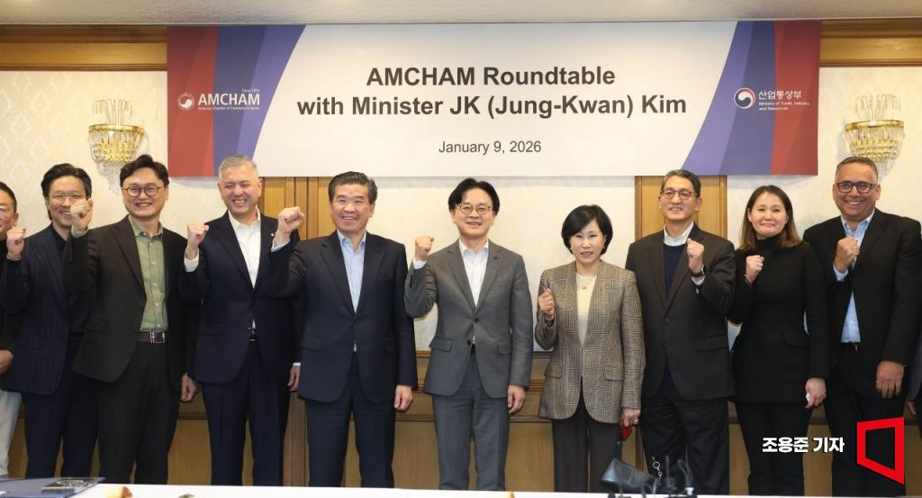 김정관 산업통상부 장관(가운데)이 9일 서울 종로구 정부서울청사에서 열린 주한미국상공회의소(AMCHAM) 초청 간담회에 참석, 제임스 김 암참 회장(왼쪽 네번째) 등과 기념촬영을 하고 있다.