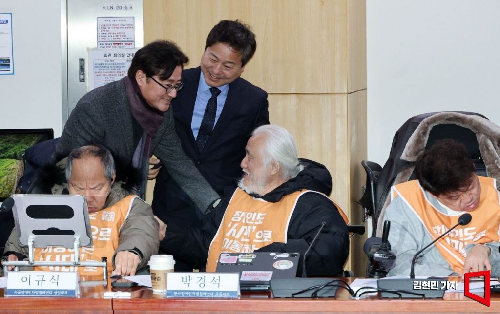 홍익표, 김영배 더불어민주당 의원과 박경석 전장연 상임대표 등 참석자들이 9일 국회 의원회관에서 열린 전국장애인차별철폐연대와의 대화에서 만나 인사하고 있다. 2026.1.9 김현민 기자