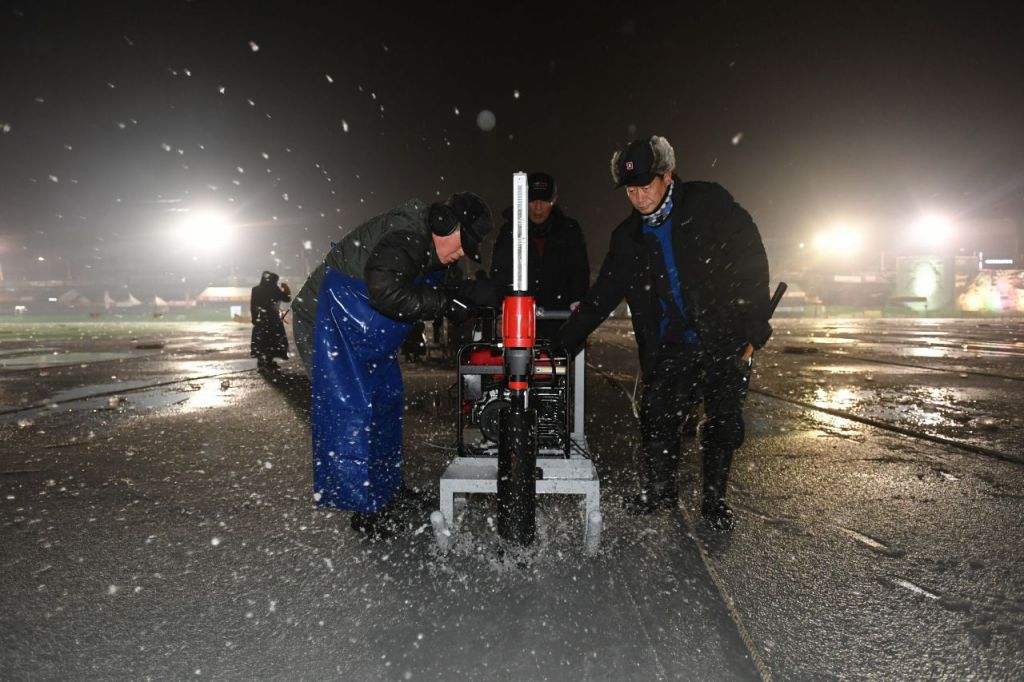 축제 관계자들이 10일 새벽 영하의 추위 속에서도 얼음판 위에 수천 개의 구멍을 뚫으며 본격적인 낚시 채비에 나서고 있다. 화천군 제공