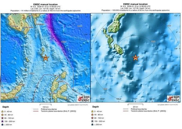11일(현지시간) 유럽지중해지진센터(EMSC) 등에 따르면 전날 오후 9시58분께 술라웨시섬 북쪽 탈라우드 제도 해역에서 규모 6.5 지진이 발생했다. 말루쿠 제도에 있는 북말루쿠주 토벨로에서 북서쪽으로 245㎞ 떨어진 지점이다. 진앙은 북위 3.69도, 동경 127도이며 지진 발생 깊이는 54㎞로 파악됐다.