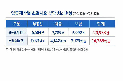 감사원은 이 같은 방식으로 2020년 12월부터 2023년 12월까지 압류해제 2만933건에서 체납액 1조4268억원이 위법하게 소멸됐다고 봤다. 자산별로는 부동산 7021억원, 예금 4142억원, 보험 3179억에 달하는 것으로 집계됐다.