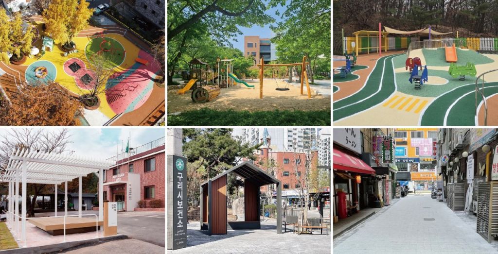 경기도가 추진한 유니버설 디자인 준공 대상지. 위 왼쪽부터 시계방향으로 과천시, 안양시, 파주시, 구리시, 구리시, 양주시