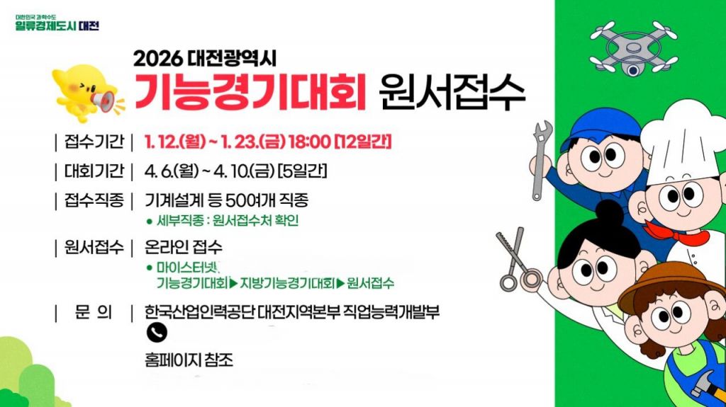 대전시가 '2026년도 대전광역시 기능경기대회' 참가자를 오는 23일까지 모집한다.