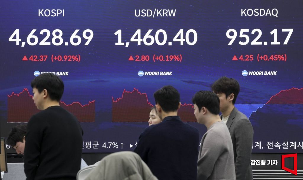 코스피 지수가 전 거래일 대비 53.57포인트 상승한 4639.89로 시작하며 사상 최고치를 재경신한 12일 서울 중구 우리은행 본점 딜링룸 전광판에 국내증시 현황이 표시돼 있다.