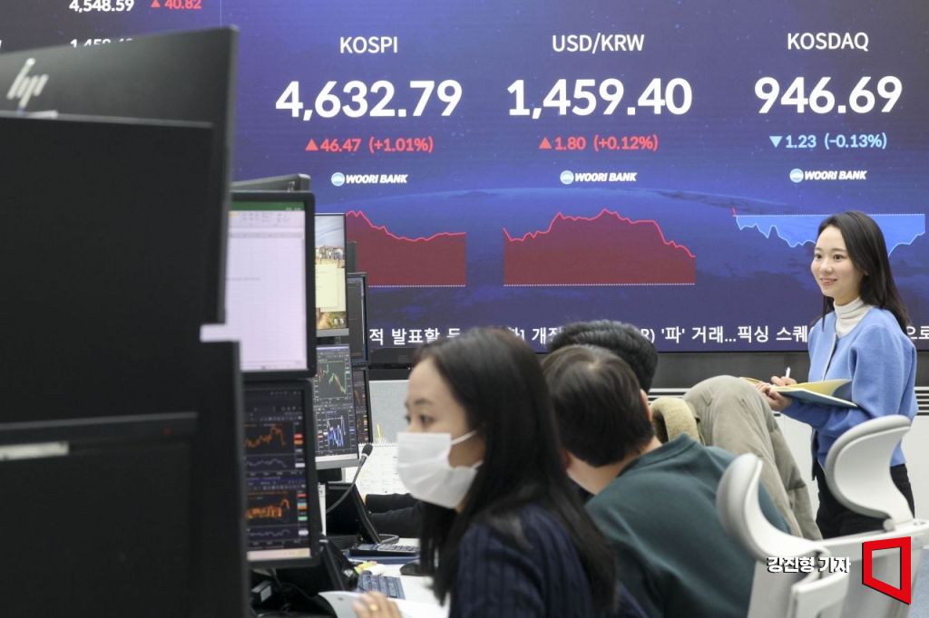 코스피 지수가 전 거래일 대비 53.57포인트 상승한 4639.89로 시작하며 사상 최고치를 재경신한 12일 서울 중구 우리은행 본점 딜링룸 전광판에 국내증시 현황이 표시돼 있다.