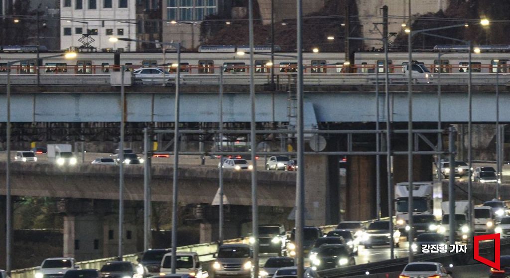 지난 2일 서울 성동구 동호대교 인근에서 출근 시간대 지하철과 차가 달리는 모습.