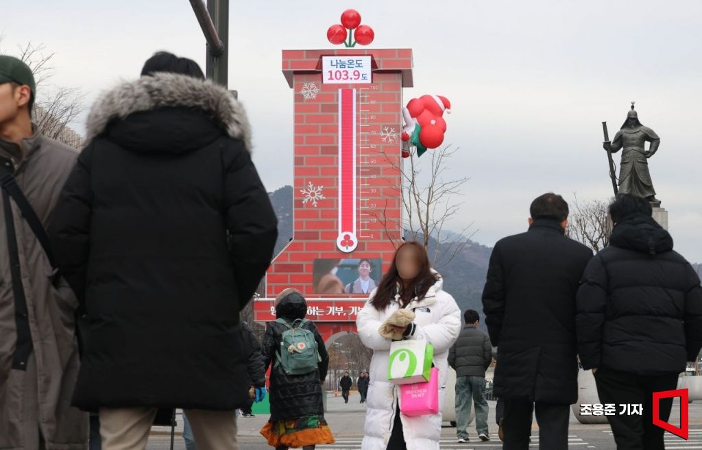 12일 서울 종로구 광화문 광장에 설치된 사랑의 온도탑에 나눔온도가 103.9도를 나타내고 있다. 사랑의열매 사회복지공동모금회는 이날 '희망2026나눔캠페인'의 사랑의 온도탑 나눔 온도가 전날 100도를 돌파했다고 밝혔다.