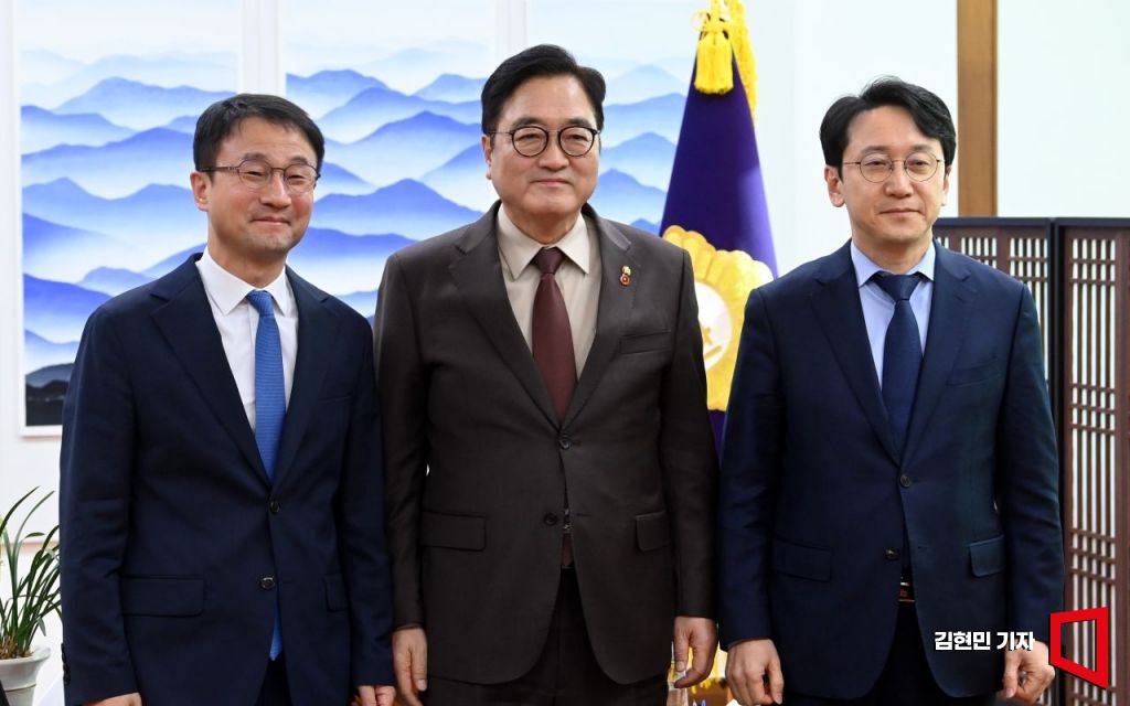 우원식 국회의장(가운데)이 12일 국회에서 한병도 더불어민주당 신임 원내대표(왼쪽), 천준호 신임 원내운영수석부대표와 기념촬영을 하고 있다.