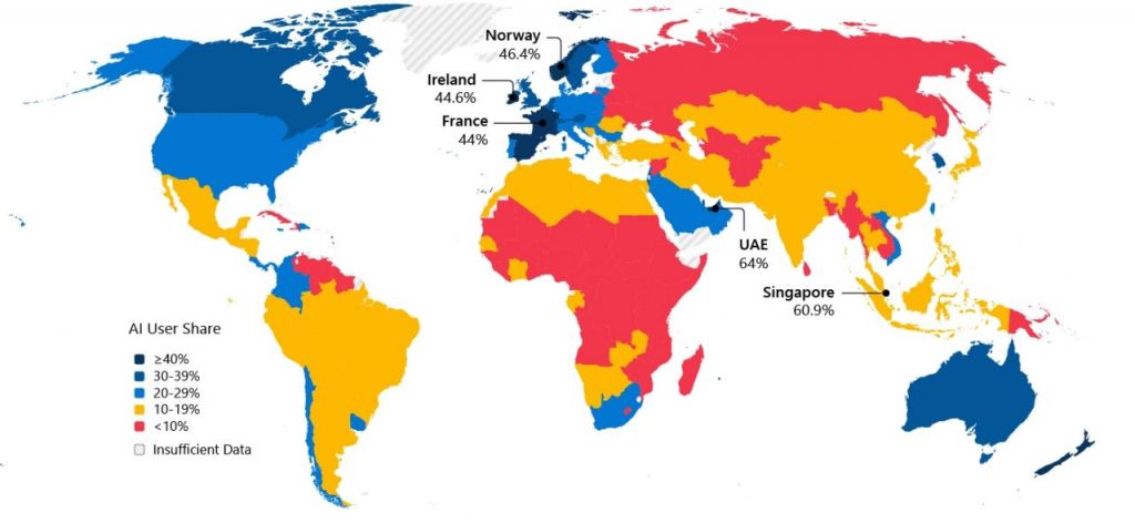 한편, 보고서에 따르면 2025년 하반기 기준 전 세계 생성형 AI 채택률은 상반기 대비 1.2%포인트 상승한 16.3%를 기록했다. 다만 선진국 중심의 글로벌 노스(Global North)와 신흥국 중심의 글로벌 사우스(Global South) 간 AI 채택률 격차는 커진 것으로 나타났다.