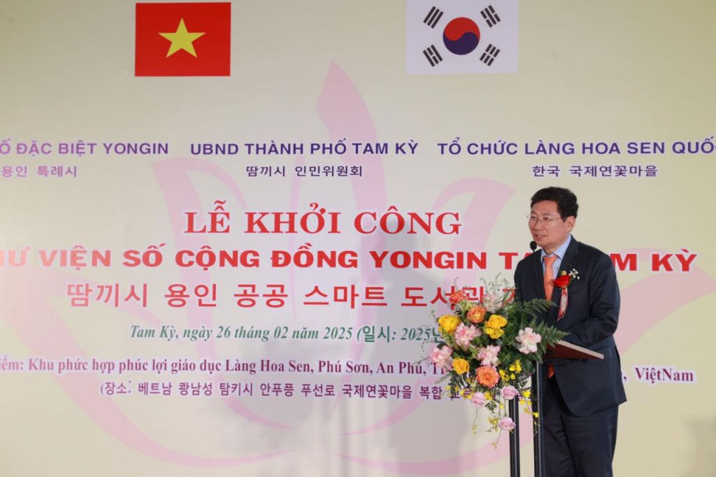 이상일 용인시장이 지난해 2월 베트남 국제연꽃마을에서 열린 '용인 스마트 디지털도서관' 착공식에서 인사말을 하고 있다. 용인시 제공