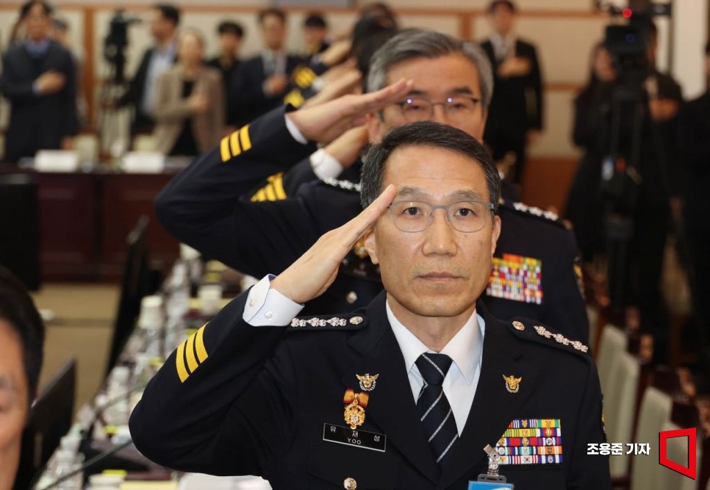 유재성 경찰청장 직무대행을 비롯한 경찰간부들이 12일 서울 종로구 정부서울청사에서 열린 경찰청 업무보고에 참석, 국민의례를 하고 있다.