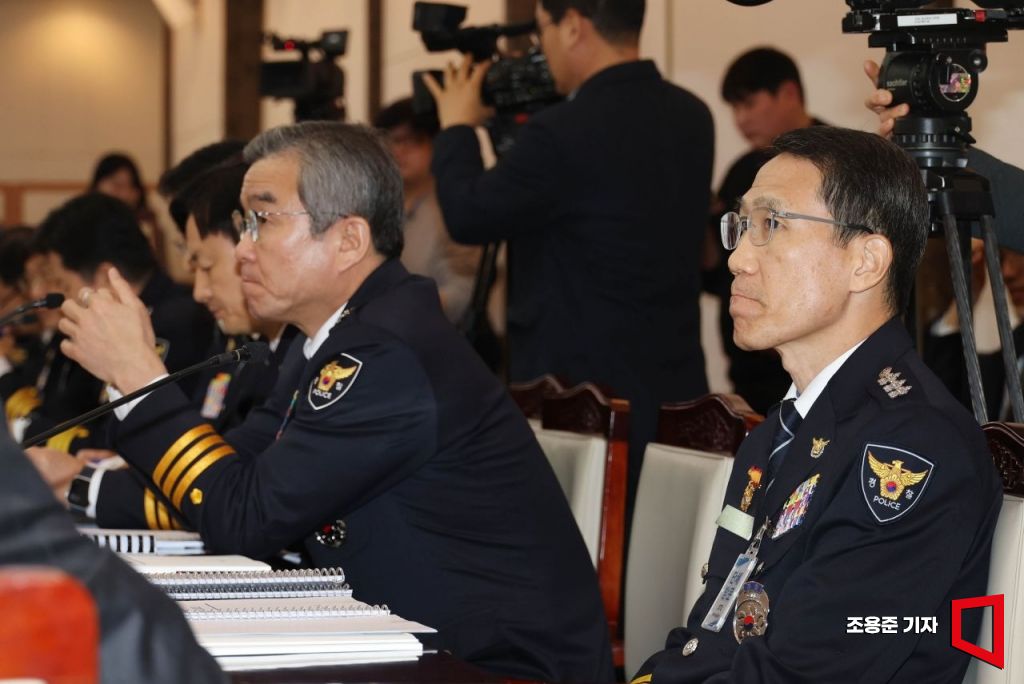 유재성 경찰청장 직무대행(오른쪽)이 12일 서울 종로구 정부서울청사에서 열린 경찰청 업무보고에 참석해 윤호중 행정안전부 장관 입장을 기다리고 있다.