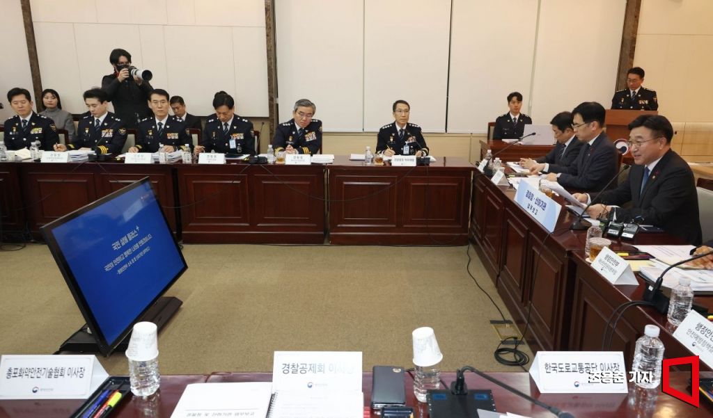 윤호중 행정안전부 장관이 12일 서울 종로구 정부서울청사에서 열린 경찰청을 비롯해 경찰공제회, 총포화약안전기술협회, 한국도로교통공단 등 산하기간 3곳에 대한 업무보고에 앞서 모두발언을 하고 있다.