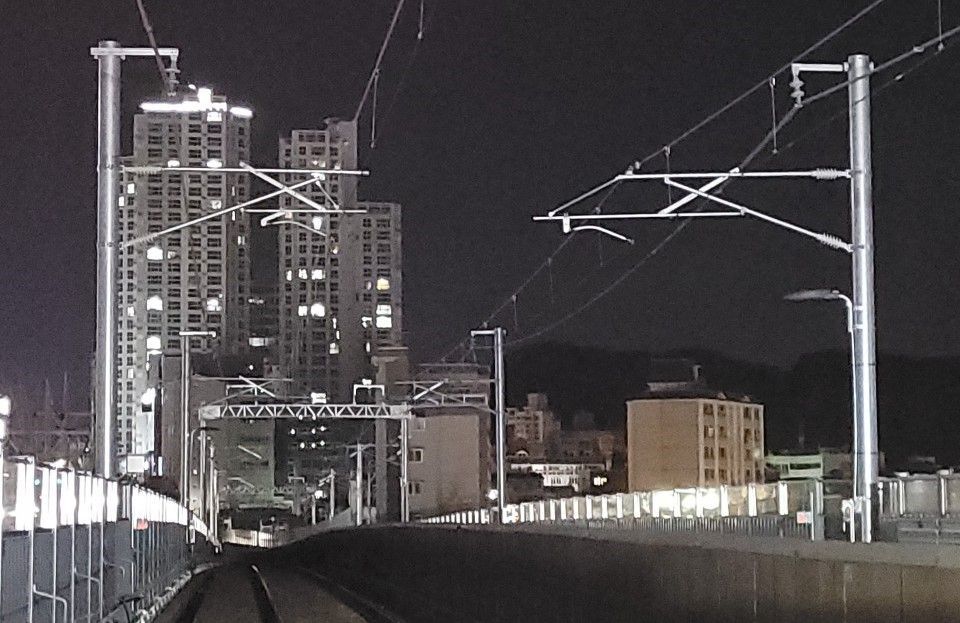 부산도시철도 1호선 노포~교대 지상구간 전차선로 지지물 개량 공사 후 현장.