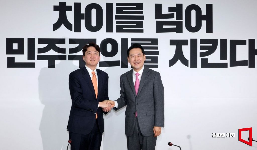 장동혁 국민의힘 대표(오른쪽)과 이준석 개혁신당 대표가 13일 국회에서 만나 악수하고 있다.