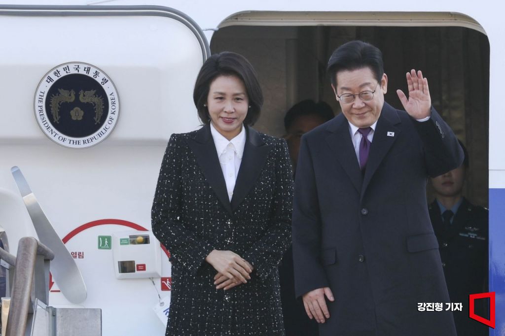 이재명 대통령이 다카이치 사나에 일본 총리와 정상회담을 하기 위해 12일 경기 성남 서울공항에서 김혜경 여사와 출국 하며 인사 하고 있다.