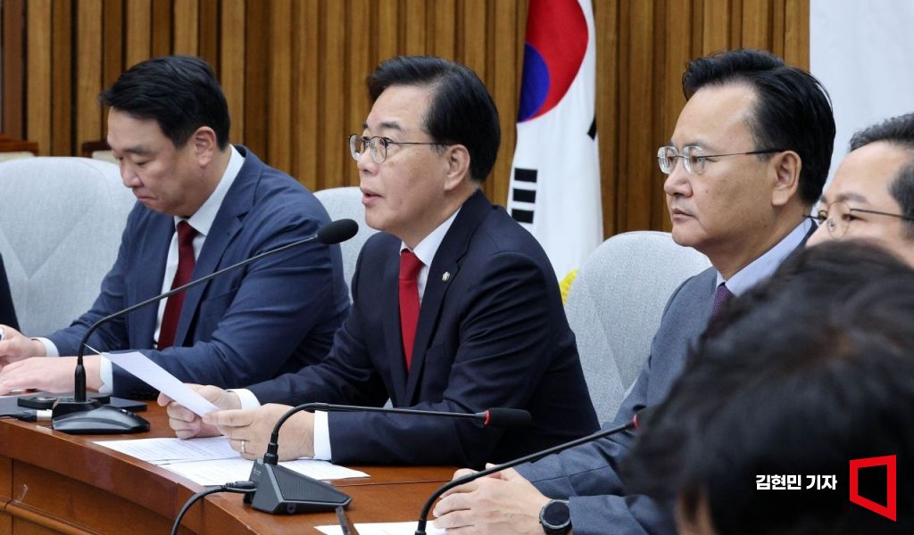 송 원내대표는 "3대특검 재연장법 수사 대상에는 지자체 동조 혐의를 포함했다"며 "국민의힘 현역 단체장을 근거 없이 동조범으로 몰아 정치적 타격 주겠다는 선거 공작"이라고 꼬집었다.