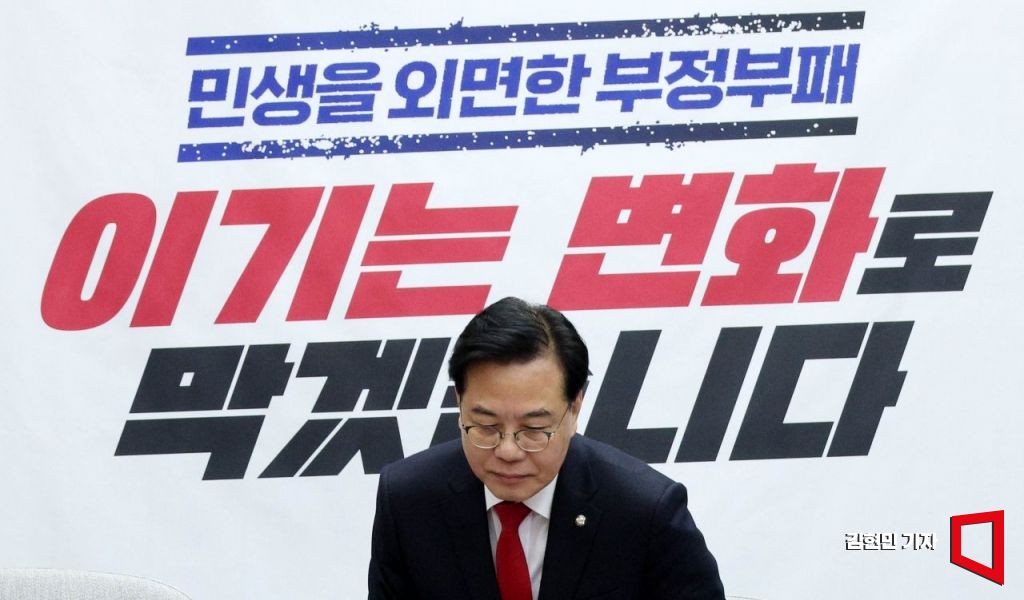 송언석 국민의힘 원내대표가 13일 국회에서 열린 원내대책회의에 참석하고 있다.