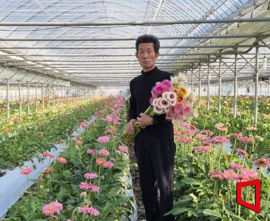 봉화군 물야면 황원욱 농업인, 농식품부 장관 표창 품질 고도화·기술 전수로 산업 체질 바꿔, 황원욱씨 본인 화훼 단지에서 꽃을 들고 미소 짓고 있다.