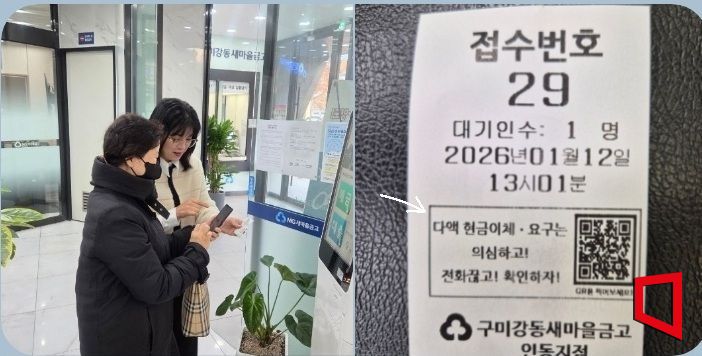 경북 구미경찰서는 13일 최근 급증하는 보이스피싱 범죄로부터 시민의 재산 피해를 예방하기 위해 새마을금고와 협조하여 번호대기표를 활용한 보이스피싱 예방 홍보를 추진한다고 밝혔다.