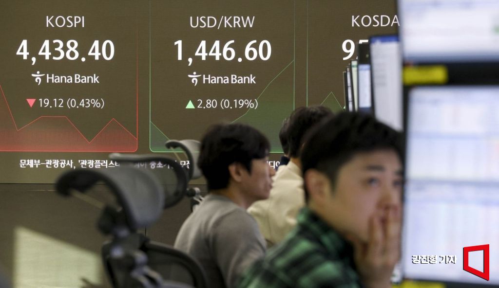 코스피 지수가 전 거래일 대비 12.33포인트 하락한 4445.19에 장을 시작한 6일 서울 중구 하나은행 딜링룸 전광판에 국내증시 지수가 표시돼 있다. 2026.1.6 강진형 기자