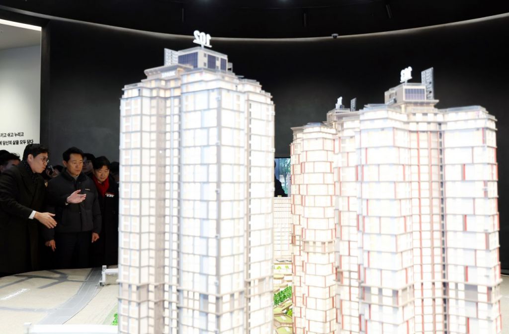 지난 12일 오세훈 서울시장(가운데)이 서울 노원구 월계동의 '서울원 아이파크' 모델하우스를 살펴보며 관계자의 설명을 듣고있다. 연합뉴스.