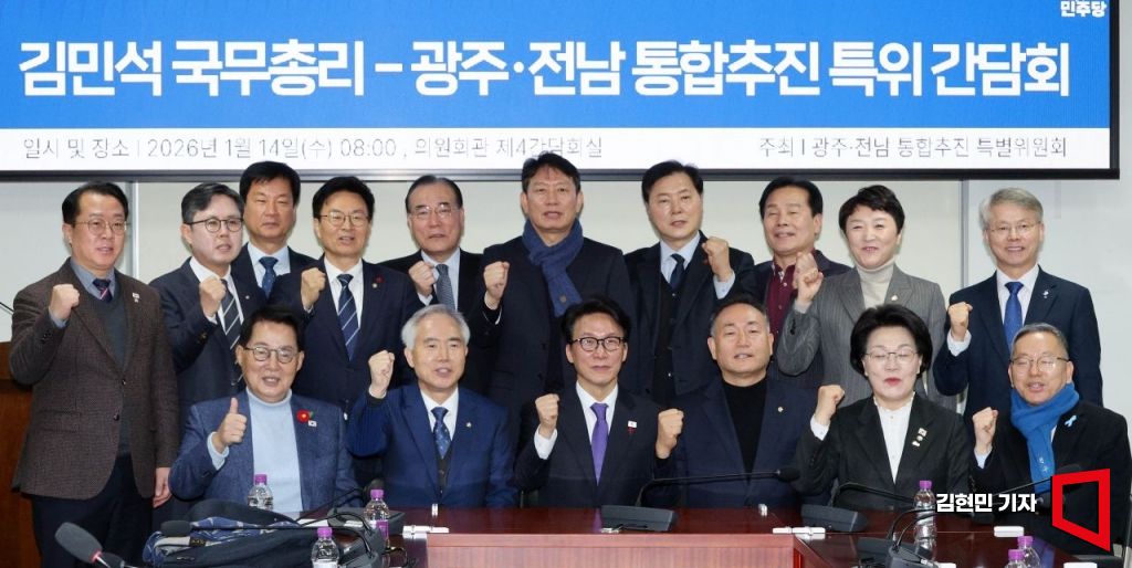 김민석 국무총리가 14일 국회 의원회관에서 열린 광주ㆍ전남 통합추진 특위 간담회에서 참석 의원들과 기념촬영을 하고 있다.