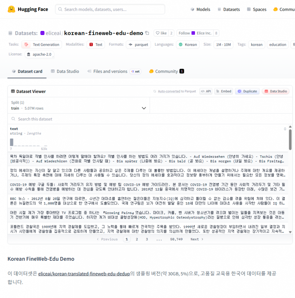 허깅페이스에 공개된 엘리스그룹 한국어 파인웹 교육 데이터셋 데모. 엘리스그룹
