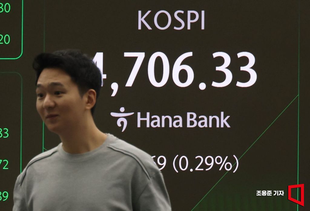 새해 들어 코스피가 연일 신고가 행진을 이어가며 사상 첫 장중 4700선을 돌파한 14일 서울 중구 하나은행 본점 딜링룸 현황판에 코스피, 원/달러환율, 코스닥 등이 표시돼 있다. 이날 코스피는 전장보다 7.53p(0.16%) 내린 4,685.11출발해 상승폭을 키우고 있다.