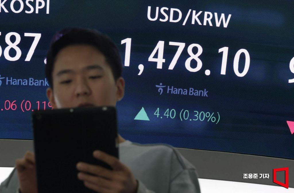 14일 서울 중구 하나은행 본점 딜링룸에서 직원이 환율을 모니터하고 있다. 이날 원/달러 환율은 일본 엔화 약세 속에 열흘째 상승세를 지속하며 1,480원에 바짝 다가섰다.