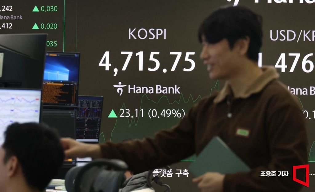 새해 들어 코스피가 연일 신고가 행진을 이어가며 사상 첫 장중 4715선을 돌파한 14일 서울 중구 하나은행 본점 딜링룸 현황판에 코스피, 원/달러환율, 코스닥 등이 표시돼 있다. 이날 코스피는 전장보다 7.53p(0.16%) 내린 4,685.11출발해 상승폭을 키우고 있다.