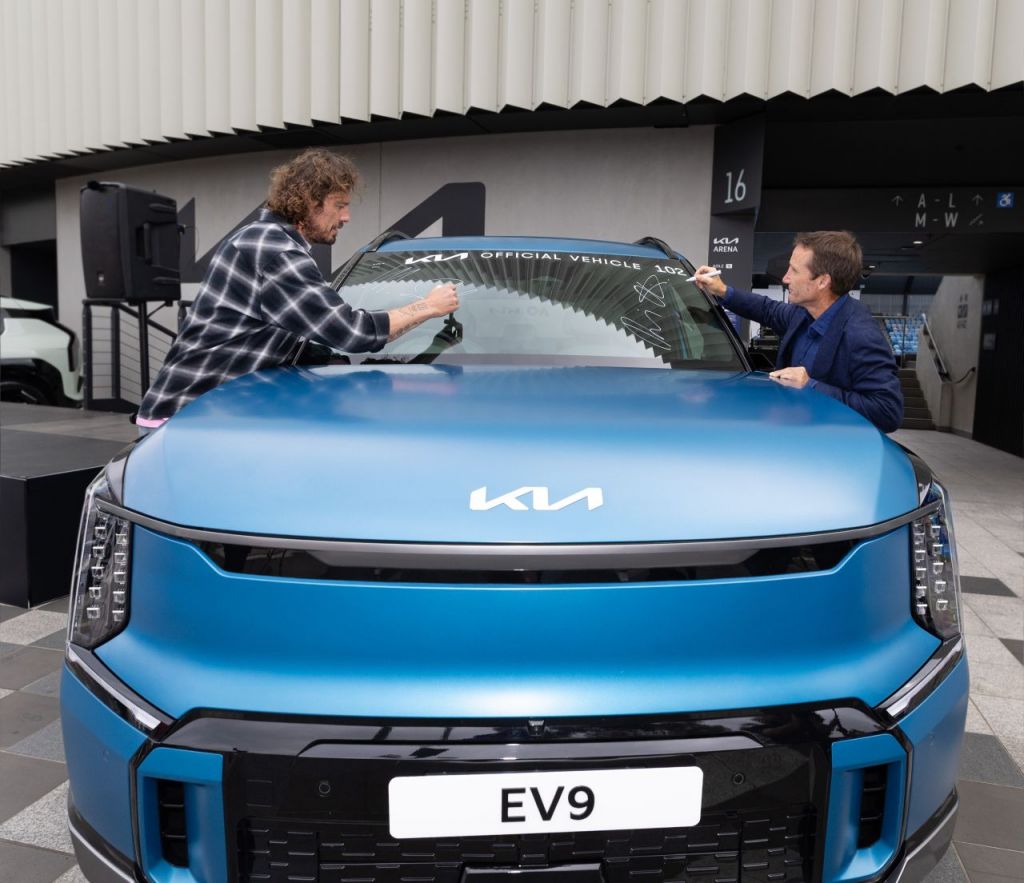 대회 공식 차량 중 EV9에 사인하고 있는 러시아 테니스 레전드 마라트 사핀과 호주 경마 레전드이자 기아 호주법인 앰버서더 데이미언 올리버. 기아 제공