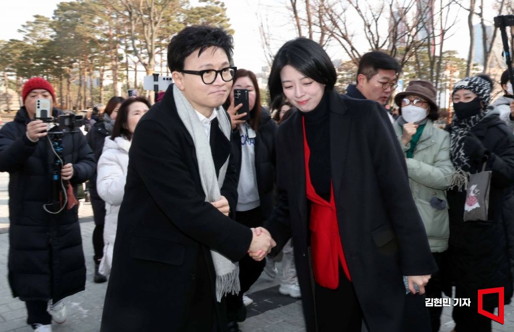 한동훈 전 국민의힘 대표가 14일 당 윤리위원회가 본인을 제명 결정한 것과 관련해 입장을 밝히기 위해 국회 소통관으로 들어서며 배현진 의원과 악수를 하고 있다.