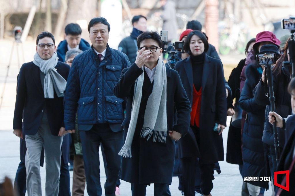 한동훈 전 국민의힘 대표가 14일 당 윤리위원회가 본인을 제명 결정한 것과 관련해 입장을 밝히기 위해 국회 소통관으로 들어서고 있다.