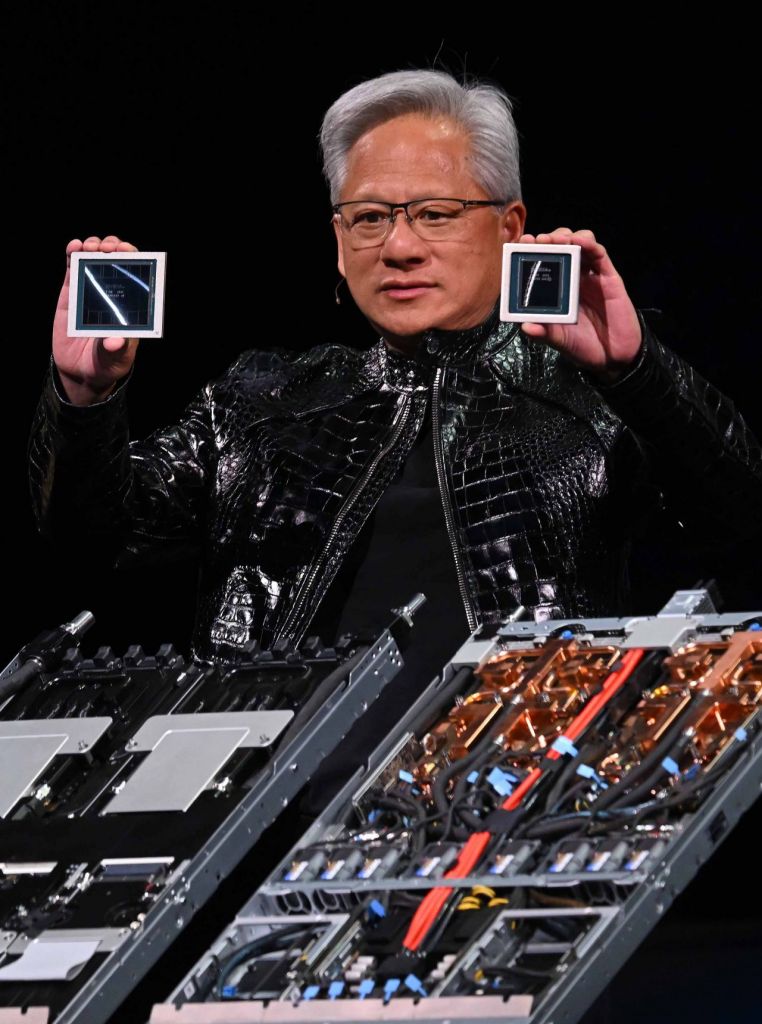 젠슨 황 엔비디아 CEO가 5일(현지시간) 미국 네바다주 라스베이거스 퐁텐블로 호텔에서 열린 엔비디아 CES 2026 라이브에서 차세대 그래픽처리장치(GPU)루빈 GPU를 선보이고 있다. 연합뉴스