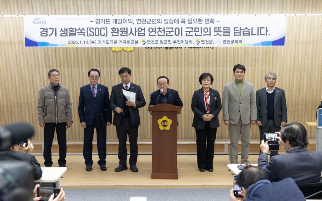 경기 연천군과 연천군 범군민 추진위원회는 14일 경기도의회 기자회견실에서 기자회견을 열고 '경기 생활쏙(SOC) 환원사업'의 공모 대상지로 연천군이 선정되어야 한다는 당위성과 필요성을 공식적으로 밝혔다.