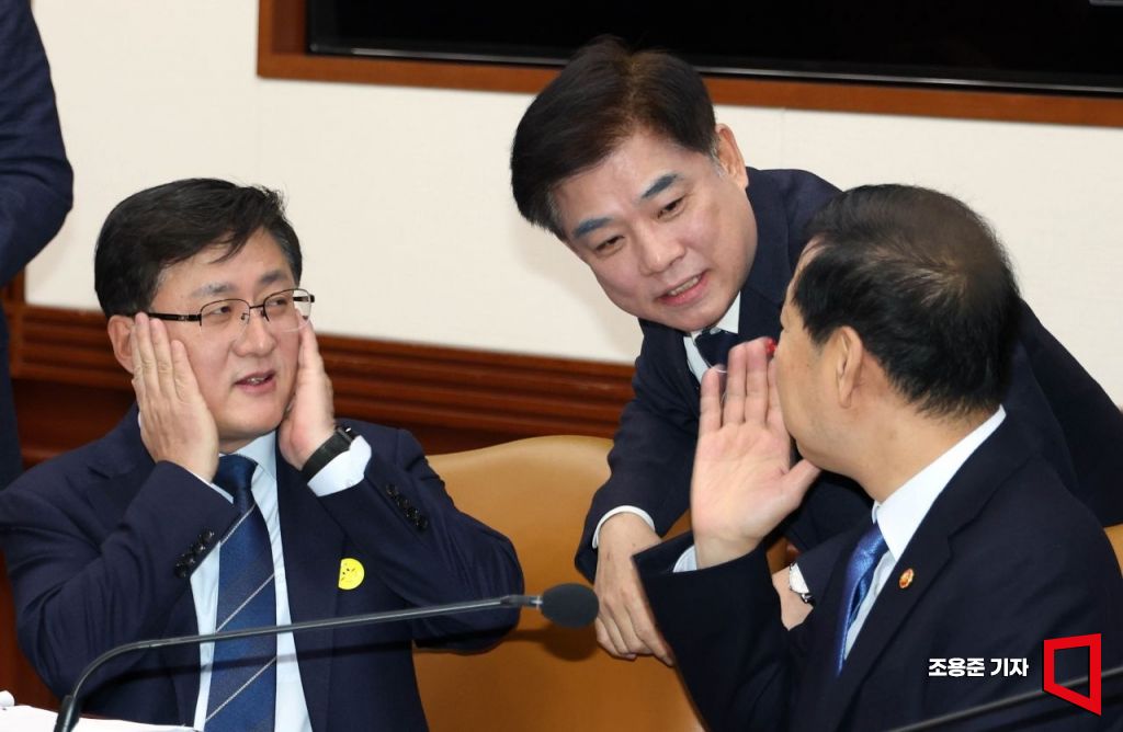 구윤철 경제부총리 겸 재정경제부 장관(오른쪽부터), 김병욱 청와대 정무비서관, 김성환 기후에너지환경부 장관이 15일 서울 종로구 정부서울청사에서 열린 국가정책조정회의에 참석 대화를 하고 있다.