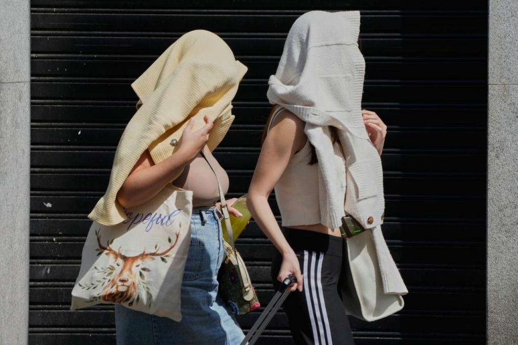 지난해 극단적인 더위가 찾아온 스페인 마드리드에서 시민들이 태양을 피해 옷을 뒤집어 쓴 모습. AP연합뉴스