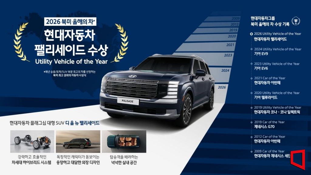 현대차는 14일(현지시간) 미국 디트로이트 헌팅턴 플레이스에서 열린 '2026 북미 올해의 차(NACTOY)' 시상식에서 팰리세이드가 유틸리티 부문 '북미 올해의 차'로 최종 선정됐다고 15일 밝혔다.