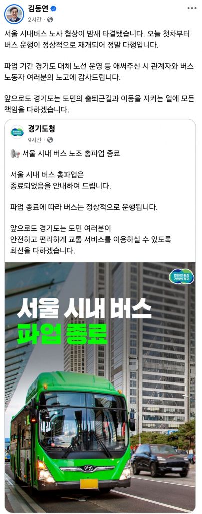 이어 "파업 기간 경기도 대체 노선 운영 등 애써주신 시 관계자와 버스 노동자 여러분의 노고에 감사드린다"며 "경기도는 도민의 출퇴근길과 이동을 지키는 일에 모든 책임을 다하겠다"고 약속했다.