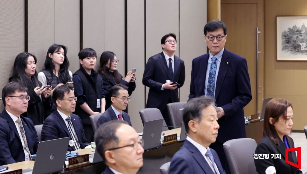 이창용 한국은행 총재가 15일 오전 서울 중구 한국은행 본관에서 열린 금융통화위원회 본회의에 참석하고 있다.