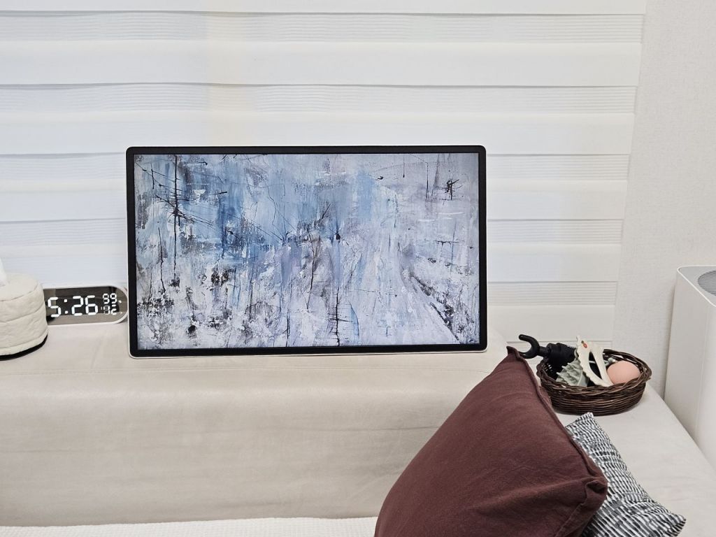 제품을 켰을 때 모니터의 화질도 나쁘지 않은 수준이었다. 다만 이동식 소형 스크린이라는 점을 감안해 대형 OLED TV 수준의 화질을 기대하지 않는 것이 좋다. 27형 QHD 해상도에 고주사율인 120Hz를 지원해 유튜브나 OTT에서 최고 화질을 선택했을 때도 화소의 깨짐 현상 없이 부드럽게 잘 구현됐다. 필요할 경우 고사양 게임을 즐기기까지 무리가 없을 것 같다. 무광의 모니터가 일반 TV 화면보다는 살짝 어두운 듯한 느낌을 주었지만, 화면 밝기가 상당해 거슬리진 않았다. 특히 삼성전자의 '아트 스토어'를 통해 디지털 액자를 활용했을 때 무광 화면이 생각했던 것보다 더 잘 어울렸다. 아트 스토어를 구독하면 3500여점의 디지털 예술 작품을 이용할 수 있다고 한다.
