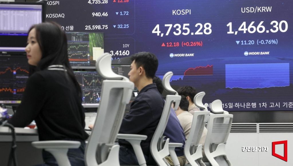 코스피 지수가 하락 출발 뒤 상승전환해 한때 4740선을 넘어서며 장중 기준 최고가를 경신한 15일 서울 중구 우리은행 본점 딜링룸 전광판에 국내증시 지수가 표시돼 있다. 이날 원달러 환율은 전 거래일 대비 12.5원 내린 1465원에 거래를 시작했다.