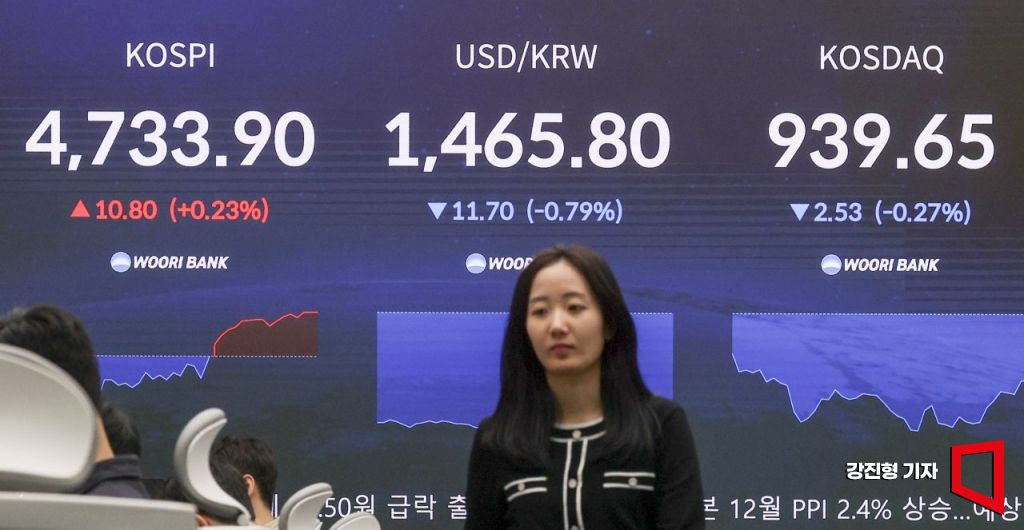 코스피 지수가 하락 출발 뒤 상승전환해 한때 4740선을 넘어서며 장중 기준 최고가를 경신한 15일 서울 중구 우리은행 본점 딜링룸 전광판에 국내증시 지수가 표시돼 있다. 이날 원달러 환율은 전 거래일 대비 12.5원 내린 1465원에 거래를 시작했다.